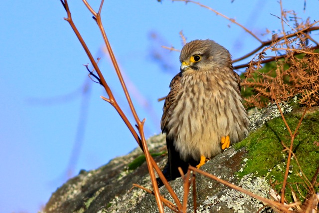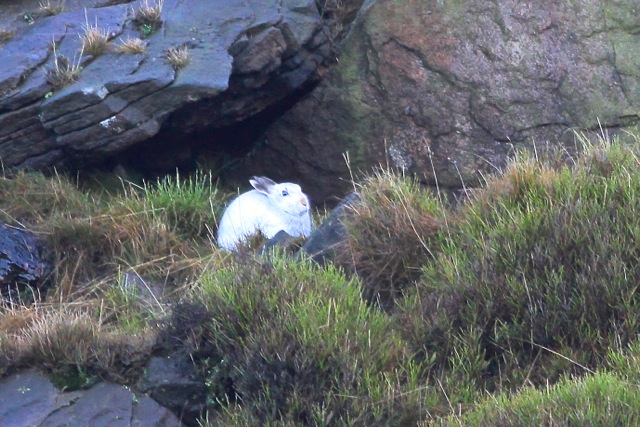 Saddleworth Moor, despite its grim reputation, was looking beautiful in the bright sunshine as we arrived at RSPB Dove Stone. Walking up Chew Road towards Chew Reservoir we were treated to excellent views of a female/juvenile Kestrel which perched for long intervals on a rock beside the track. Further along, our keen-eyed leader Colin spotted far off across the moor a white blob which, to the unpractised eye, might have been a stray plastic bag. Looking through the scope, however, this was definitely what we had mainly set out to see – a Mountain Hare in full winter regalia. Shortly afterwards, on the other side of the track, we obtained much better views of an equally beautiful animal, which provided some good photo opportunities. The hare seemed unperturbed by a helicopter which was passing almost directly overhead transporting stone to fill in the moorland grips (drains). A huge area of the moor is now managed by the RSPB and there are healthy breeding populations of Dunlin, Golden Plover and other waders.