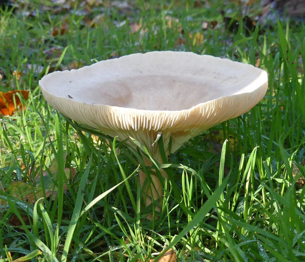After our picnic lunch we found several more fungi species including some with intriguing names such as White Saddle, Stinking Dapperling, Shaggy Inkcaps, Cavalier, Plums and Custard, Greening Coral and Sulphur Tuft; also Deceiver and Wood Blewitt. The Deceiver is in the genus Laccaria and as its name suggests its cap colours are very variable and may cause difficulty in identification. Blewitts are in the genus Lepista and many are edible. The distinctive character is the pink spores, noticeable as a pink flush on the gills as they mature.